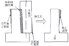 - 通過加工變形模擬分析,得到的工件在加工過程中的變形分布狀況和趨勢。由于加工變形產生讓刀誤差,其結果必然產生一定的尺寸誤差(如圖5(a))。為了有效補償這種因上件剛性不足而產生的加工變形,可以讓刀具偏擺一定的角度(如圖5(b))。刀具偏擺數控補償,即是根據模擬分析加工變形的大小,在數控編程時讓刀具在原有走刀軌跡中按變形程度附加連續偏擺,補償因變形而產生的讓刀量。通過刀具偏擺數控補償,可以將讓刀殘余材料基本切除,一次走刀即可保證薄壁件壁厚精度。