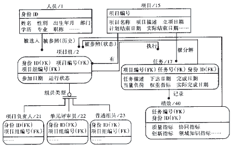 如圖3,采用IDEFIX 建模分析方法,建立了基于PDM 的組織管理信息模型。在實際的并行產品設計中,人員必然會處于多任務狀態、甚至是多項目的多任務狀態。因此,人員的狀態信息和動態能力信急對于組織資源的高效調度至關重要。任務的“當量負荷”和“權重指標”兩個屬性描述了人員的狀態信息。績效作為任務的子實體模型為組織資源調度提供動態能力信息,其中“質量指標”屬性反映人員提交任務的約束滿足度(時間約束、成本約束等相關約束), “協同指標”屬性反映任務執行過程中和相關人員的協調性,“創新指標”屬性反映提交任務的創新程度,“領域知識指標”屬性反映人員在執行任務過程中體現的相關領域知識和利用工具的熟練程度。利用任務狀態信息和績效動態能力信息以及人員庫可以實現企業層和項目層組織資源優化和快速調度。