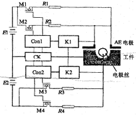 慢走絲線切割控制電解銹蝕放電狀態電源系統中運用功率MOSFET(金屬氧化物半導體場效應管)作為開關元件。幅值相同的直流電源E和E(100~150V)通過功率MOSFET M1、M2、M3、M4和限流電阻R1、R2、R3、R4將工作電壓直接加到電極絲、工件和AE(電解銹蝕控制)電極間??刂破鰿on1控制M1、M2;控制器Con2控制M3、M4,它們輸出的脈沖信號在相位上互差180°。為了適應不同加工材料和加工過程,控制器Con1和控制器Con2對電極絲和工件間及工件和AE電極間的脈寬和脈間信號分別進行調節。檢測電路K1和檢測電路K2分別檢測AE電極和工件及工件和電極絲間的電壓信號即加工狀態信號和控制電解放電狀態信號,這兩種信號在控制器Con1和控制器Con2中與事先給定信號進行運算后控制M1、M2、M3、M4為了防止加工過程中過電流損壞功率MOSFET,用電流傳感器CK來檢測加工過程的電流信號,從而也保證了加工過程的穩定。在此電路中R1、R2阻值是R3、R4的3~4倍,這樣,使電流Ia和Ie的絕對值不超過漏電流Ia和放電電流Ie。不然的話,從AE電極上溶解的金屬陽離子將沉積到工件表面上,不但達不到控制電解銹蝕的目的,反而影響了工件的表面粗糙度和表面精度。