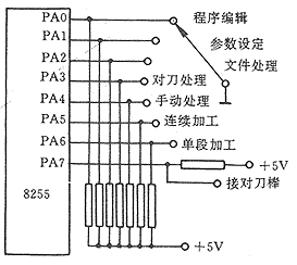 系統(tǒng)功能選擇的方法有幾種不同的方式,使用CRT顯示器作為顯示終端時(shí),可以制作功能菜單,用戶可以通過菜單選擇功能。但經(jīng)濟(jì)型數(shù)控系統(tǒng)為了降低成本,一般不用CRT顯示器,而用數(shù)碼管組成顯示終端。這時(shí)可用波段開關(guān)通過并行接口組成功能選擇電路。圖1是由接口電路8255和波段開關(guān)組成功能選擇電路的原理圖。在系統(tǒng)啟動(dòng)后的主程序和以后的各個(gè)功能程序中,通過8255循環(huán)檢測波段開關(guān)的位置,并轉(zhuǎn)入相應(yīng)的功能模塊。