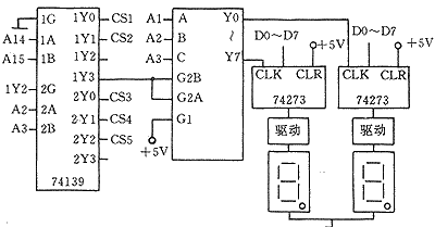 靜態(tài)顯示使用的元器件多,電路復(fù)雜,每個(gè)數(shù)碼管有一個(gè)段顯示地址,無位顯地址。每個(gè)數(shù)碼管上有一個(gè)鎖存器將要顯示的數(shù)據(jù)鎖存,這種顯示方法只要不向數(shù)碼管送新的數(shù)據(jù),其顯示內(nèi)容不會(huì)消失。如果顯示數(shù)據(jù)不變,不需要顯示刷新,只有在要顯示的數(shù)據(jù)發(fā)生變化時(shí),才需要向顯示器注入要顯示的數(shù)據(jù)。由于系統(tǒng)中有EPROM(用來存放系統(tǒng)程序),RAM(用來存放加工程序),接口電路8255(用來作輸入、輸出)等,每片內(nèi)存都要有一定的地址范圍,而數(shù)碼管地址可以連續(xù)。為解決這個(gè)問題可以采用二級(jí)譯碼,電路原理如圖3所示。圖中CS1作為系統(tǒng)的EPROM片選信號(hào),CS2作為系統(tǒng)的RAM片選信號(hào),CS3、CS4及CS5作為系統(tǒng)的8255片選信號(hào)。3—8譯碼器用來處理顯示,若系統(tǒng)中有多排數(shù)碼管時(shí),可以使用多個(gè)3—8譯碼器,不同的3—8譯碼器A、B、C端接不同的地址線。