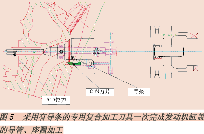 例如為適應高速加工的要求,復合加工刀具都必須經過嚴格的動平衡處理和驗證。為了保證滿足高精度、高精度保持性的要求,復合加工刀具對刀柄的選擇、刀具本身的制造精度、刀具材料的選擇等都有特殊的規范。如發動機缸蓋的導管、座圈加工工序是汽車行業中難加工的典型。其特點是尺寸公差小,圓度、同心度要求高,加工表面的形狀精度要求高。通過采用有導條的專用復合加工刀具(圖5)加工,很好地滿足了加工要求。該復合加工刀具具有如下特點:#p#分頁標題#e#