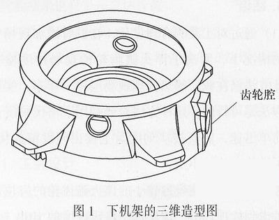 下機(jī)架是圓錐破碎機(jī)的主要結(jié)構(gòu)件,也是圓錐破碎機(jī)其他部件的裝配基礎(chǔ)。此次我廠承攬的這種結(jié)構(gòu)的下機(jī)架以前從來沒有生產(chǎn)過,不能借用過去的工藝思路,只能另辟蹊徑。通過分析鑄件結(jié)構(gòu),綜合考慮冒口放置、模樣結(jié)構(gòu)和澆注系統(tǒng)等方面內(nèi)容,設(shè)計出合理的工藝方案,生產(chǎn)出了用戶滿意的鑄件。