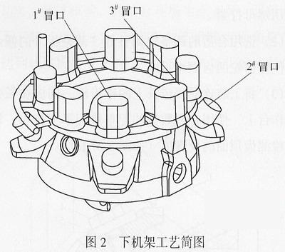 (1)冒口的設(shè)計 對鑄鋼件來說,冒口設(shè)計的好壞會直接影響鑄件質(zhì)量。根據(jù)下機(jī)架的結(jié)構(gòu)特點,擬采用在法蘭上布置一圈冒口,中間部分放置一個暗冒口(1#冒口)并加補貼,周邊凸起與主體的相交處放暗冒口(2#冒口),齒輪腔與主體相交處增加補貼至法蘭,再在法蘭上放置一個相對較大的冒口(3#冒口),如圖2所示。