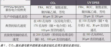 未來趨勢:半導體泵浦固體紫外激光器也用于鉆微孔。這些激光器的短波長和高光束質量可提供更小的聚焦尺度。相對于CO2激光器(能產生100 m大小范圍內的大多數微孔),小的焦點以及紫外固體激光器較低的平均功率(與CO2相比)使得紫外固體激光器處于不利地位。然而,隨著設備小型化的趨勢仍在繼續,以及對于較小的微孔的需求增加,這些激光器的應用將會擴大。表1提供了CO2激光器與紫外固體激光器在該應用方面的全面對比。
