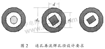 傳統模板設計和焊膏印刷技術的有機結合,可以改善通孔再流焊印刷工藝,比如改進印刷圖案,擴大印刷面積,如圖4所示。焊點所需合金體積必須根據引線形狀、通孔直徑、和基板厚度來確定要填充的釬料量,然后按所要求的填充百分比計算所需要的焊膏數量。估計焊膏中的金屬含量大約為體積的50%,計算公式如下: