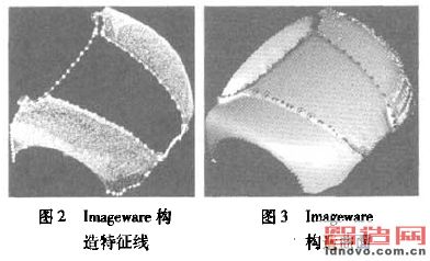 下面是在Imageware中構造汽車表面曲面模型的過程。首先利用I}nagew,的點云數據處理功能,構造特征線,對點云數據進行分割,如圖2所示。再利用image。的構面功能,根據特征線和分片的點云,構建出如圖3所示的最終曲面模型。
