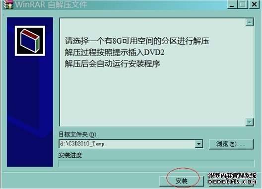 說明下,我是買的光盤,應該是有2張DVD光盤刻的,先運行DVD1 里面的C3D2010sc.part01.exe文件,把安裝程序解壓到硬盤上,然后再從硬盤上開始安裝,記住解壓需要8G 的可用空間,默認解壓位置是d:C3D2010_Temp,如果您的d 盤空間不足請選擇一個有足夠空間的分區進行解壓;