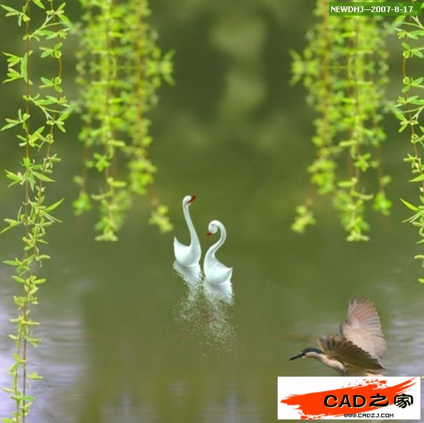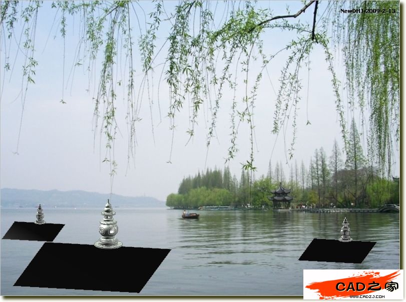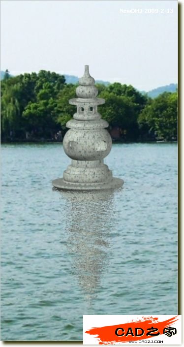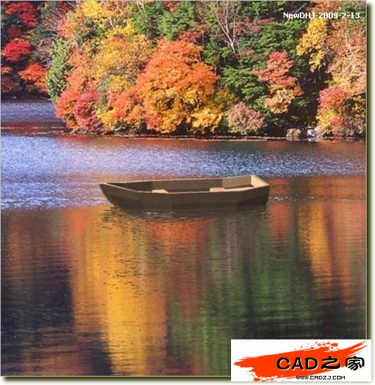 我們要把所作的模型圖,在ACAD中配合背景圖片渲染出逼真的水中倒影圖,關鍵是水中倒影的技巧,記得在做《春江水暖鴨先知》一圖時,曾與許版(xhq1954425)、鄧老(dengdinghui)、老農、bmf18826、筱諍 等朋友共同探索過,群策群力,把ACAD渲染技巧進一步挖掘了一下。