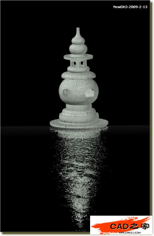 6、添上背景圖渲染的效果。其中的面域對后面的(香爐腳圖形水下部分)圖形有遮擋作用;對前面圖形有鏡像圖,但經過凹凸貼圖的圖形變形了:對背景圖卻透明,與背景圖溶入為一體