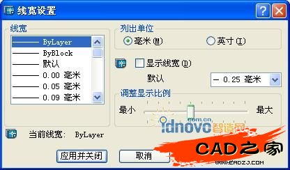 單擊“線寬設置”按鈕將彈出“線寬設置”對話框。用此對話框可以設置線寬的顯示特性和缺選項,同時還可以設置當前線寬,如圖12所示。