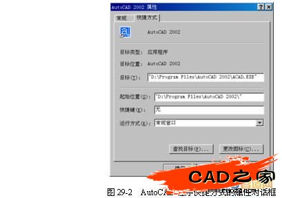通常用戶需要通過AutoCAD程序的快捷方式來啟動AutoCAD系統,并可以在快捷方式中設置AutoCAD系統啟動時的環境和操作。選擇AutoCAD程序的某個快捷方式,并查看其屬性,如圖所示。