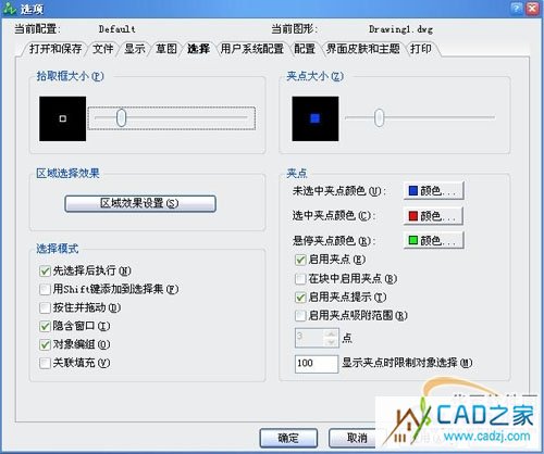 5)在“選擇”對話框中,我們可以設(shè)置拾取框大小、區(qū)域選擇效果、夾點(diǎn)大小和其他的一些設(shè)置。