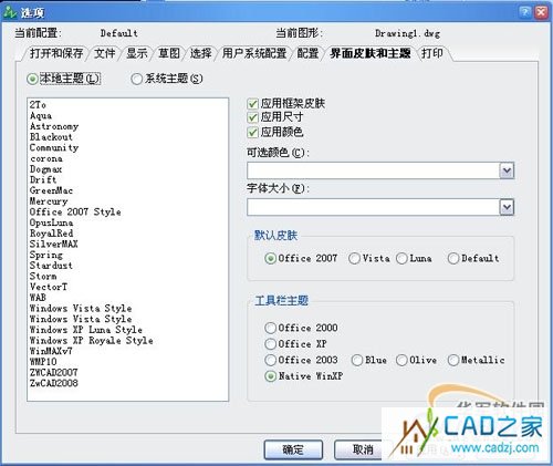 8)在“界面皮膚和主題”標(biāo)簽頁中,我們可以自由的設(shè)置自己喜歡的中望CAD界面皮膚和主題,這是中望CAD所特有的個性化的功能之一。