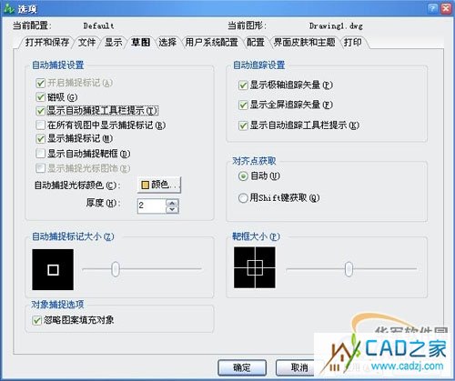 4)在“草圖”標(biāo)簽頁中,我們設(shè)置一些自動捕捉、追蹤和靶框大小等等的參數(shù)。