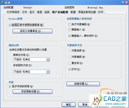 6)在“用戶系統(tǒng)配置”中,我們可以自定義設(shè)置右鍵的單擊功能。默認(rèn)情況下,中望CAD會設(shè)置為“繪圖區(qū)域中使用快捷菜單”,假如用戶習(xí)慣于右鍵單擊快捷重復(fù)上一命令和確定時,把“繪圖區(qū)域中使用快捷菜單”前的勾去掉即可。