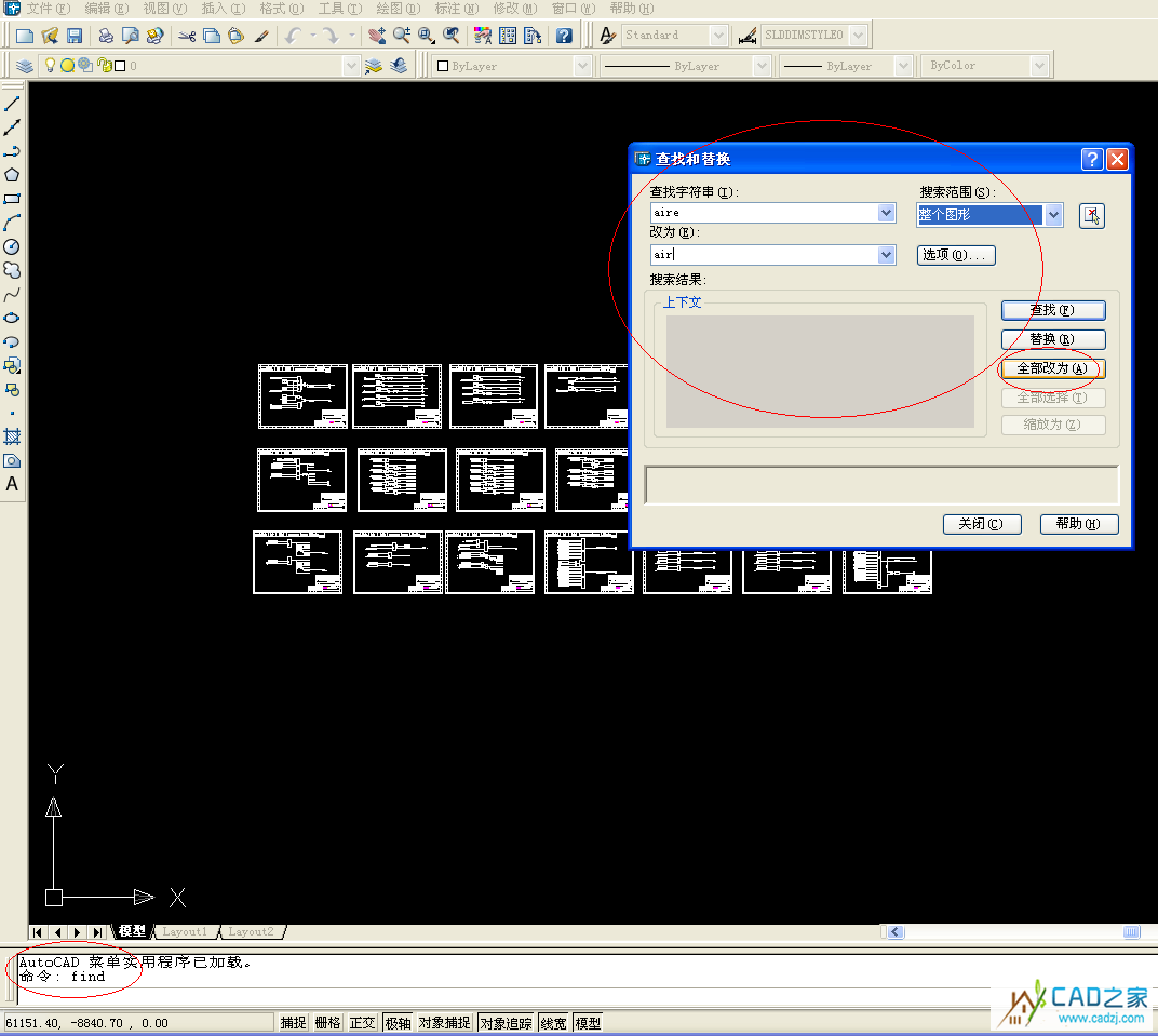 | 1.手工操作:CAD中可以用FIND命令,EXCEL可以用^f 可以實現(xiàn)當前文檔的所有替換. 2.如果要自動操作,就只能用開發(fā)工具了,用VB或VBA都可以完成!只是比較復雜. 你可以到"明經(jīng)CAD社區(qū)"去找下,也可能有現(xiàn)成的. |