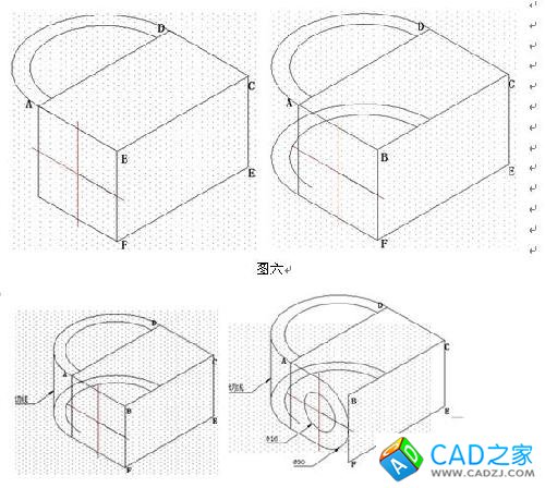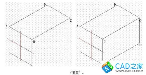 單擊鍵盤上的F5鍵,切換光標到頂平面,分別選取A、B兩點,繪制長為50的直線,連接C、D兩點,完成頂平臺的繪制。同理按F5鍵,切換光標至右平面,點取C點,繪制長為30的直線CE,連接EF,完成基準長方體的繪制(圖五)。