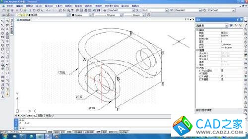 按F5鍵,將光標切換到右平面,利用line命令捕捉頂平面和底平面外環體切點繪制一條切線;再將光標切換到左平面,利用橢圓命令ellipse(同心圓I)以軸孔中心線交點為圓心繪制直徑為30和16的圓,修剪結果如圖七所示。