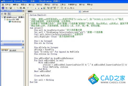'功能: 提取cad中所有塊的x,y,z生成文件在"D:vbCm.txt", 如“563865.8,2113507.5,-9”格式