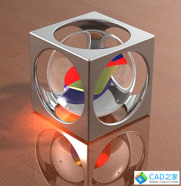 我用的圖形很簡單,一個正四方體,中心畫個球體差集后倒圓角。中心放一個球體(借用我以前畫的“小時候玩的玻璃球”)。底部畫個面域做底板。(圖01)