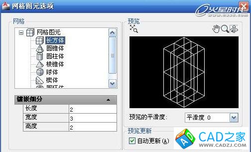 首先,在“網(wǎng)格”面板的“圖元”中設置長方形的網(wǎng)格數(shù),設置網(wǎng)格長、寬、高為:2、3、2,即可滿足雙人沙發(fā)的建模了。(圖01)
