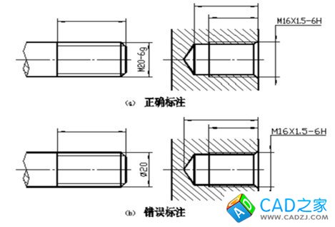 普通螺紋的尺寸標注如圖,普通螺紋的尺寸由螺紋長度、螺紋工藝結構尺寸和螺紋標記組成,其中螺紋標記一定要注在大徑上。完整的螺紋標記如下: