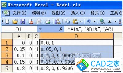 打開Excel,將保存在剪貼板里的數據粘貼到Excel表格里,得到三列數據,每列1533行。其中,A、B、C列中的數據分別是曲面上各點的笛卡兒坐 標系中的X、Y、Z值,而在AutoCAD中的笛卡兒坐標系的點坐標的輸入形式為“x,y,z”,所以我們需要對A、B、C列的數據間加個“,”。