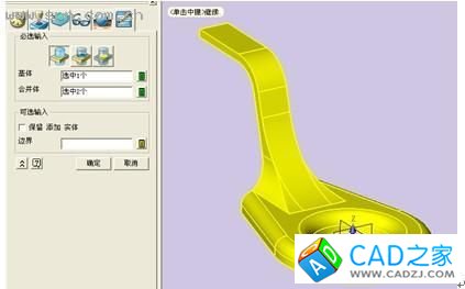 使用組合模型 功能,選擇之前做的實體為基體,上一步修剪完成的兩個實體為合并體。單擊確定,零件合并成一個實體。如圖1-21所示。