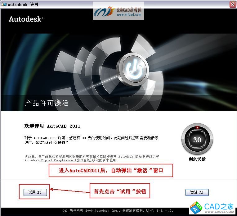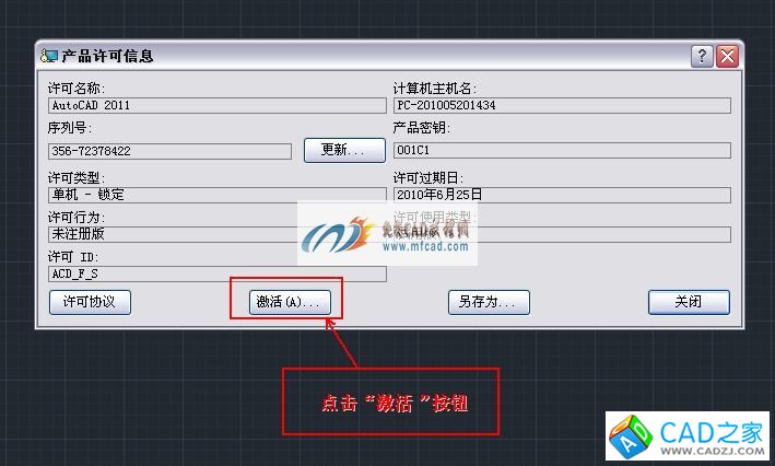 3、打開AutoCAD2011,點擊”激活“,復制“申請號”。