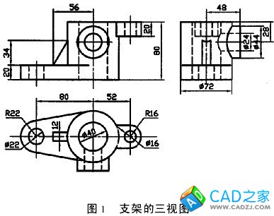 ??? 用形體分析法讀圖1,把支架分解成五部分,分別為底板、空心圓柱、耳板、肋板、空心圓柱凸臺。在此“三視圖”的文件中,以圖1為基礎,運用實體編輯和繪圖命令,如復制(Copy)、修剪(Trim)、鏡像(Mirror)、特性匹配(Matchprop)、Line(直線)等,分別整理出各部分及其相關要素的特征視圖,如圖2所示: