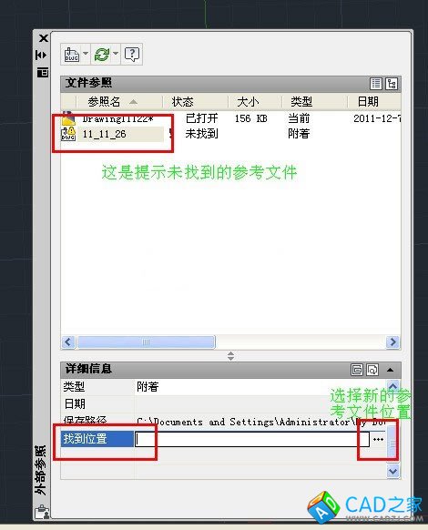 這是由于制圖時使用了參考文件造成的。而參考文件不存在或是路徑發生了變化。如果知道更該之后的參照文件位置可以選擇“更新參照文件的位置”這時可以在[詳細信息]欄中找到“更改位置”來更改: