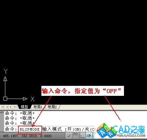 在命令行輸入快捷鍵“BLIPMODE”命令,選擇回車,這時提示我們“輸入模式”,我們輸入“OFF ",回車即可消除交叉點標記,如下圖所示: