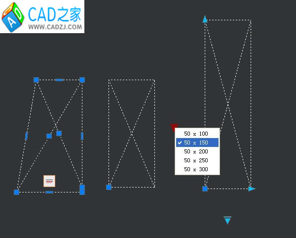 左側是繪制的普通圖形,中間是生成的普通塊,右側是定義的動態塊。單擊各自的夾點我們可以發現他們各自的特殊之處了: