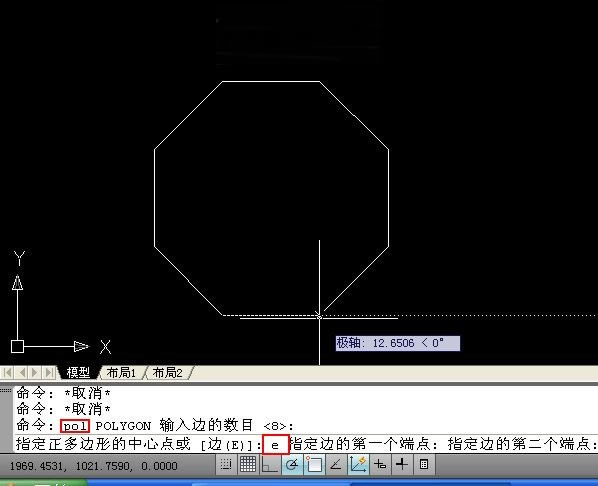 在命令行輸入正多邊形快捷鍵“pol”,指定邊數,接下來選擇“edge(或e)”參數,然后捕捉兩個端點就可以完成多邊形的繪制,這樣可以大大節省作圖時間,如下圖所示: