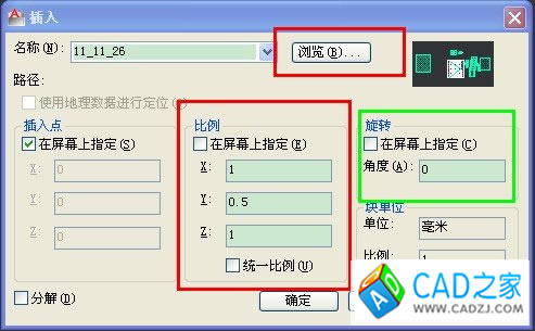 cad的不等比例縮放,可以借助塊的插入來控制不等比例縮放,我們可以對需要不等比縮放的圖形進(jìn)行文件或塊保存,再在命令行輸入“ i ”此時彈出插入對話框瀏覽保存的文件或塊,在對話框中可以設(shè)置X、Y、Z方向上的縮放比例。