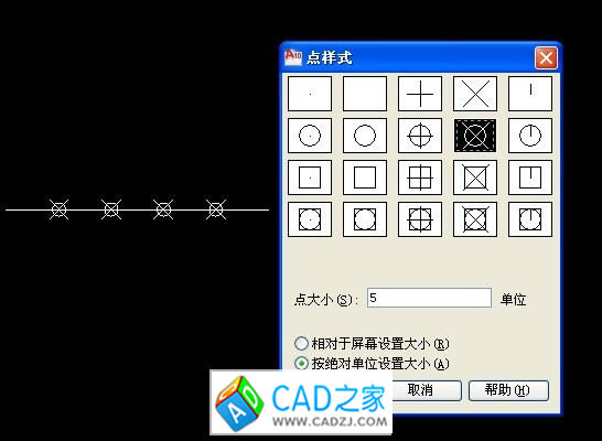 選擇菜單欄中的格式---點樣式,彈出點樣式窗口,在里面有多種點樣式圖形,可以隨意選擇樣式并且可以設置點的大小,如下圖所示: