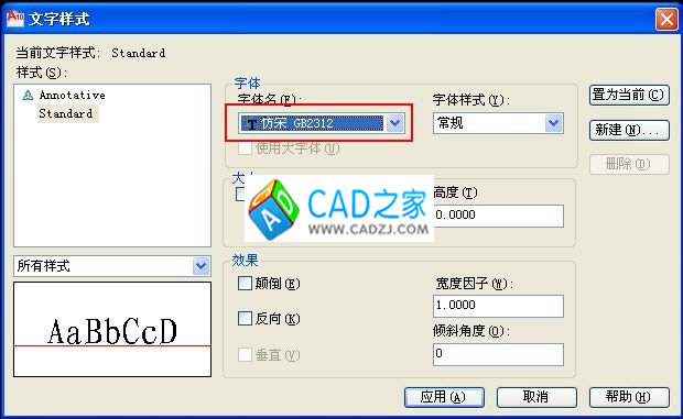 這顯然不是旋轉命令的結果,因為將字體設定旋轉之后,是將輸入的文字整行進行90°旋轉,而不是每個字各自旋轉。產生這種情況的原因是“字體樣式”中選定的中文字體有誤。通常是將字體名下拉列表框中開始部分和結尾部分的兩種字體搞混淆,因為這兩種字體名極為相像,如果同樣是仿宋體的話,那么開始部分的字體名只比結尾部分的字體名多出了“@”符號, 因為差別不大,很容易就會誤選。如果選用了帶“@”符號的字體,就會出現每個字都旋轉的情況。