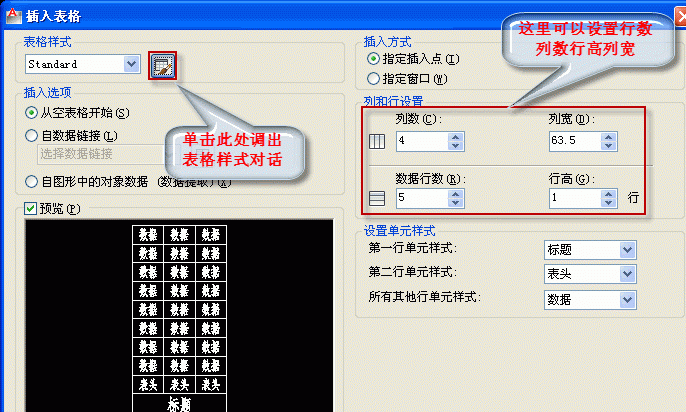 1、點擊表格命令或者在命令行輸入表格命令【TABLE】回車,彈出插入表格對話框按照繪圖要求進行設置