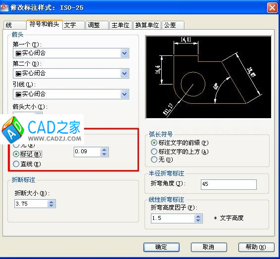 直接輸入D,打開標注樣式管理器,在“文字和箭頭”選項卡下,將圓心標記設置成其他格式的。如下圖所示: