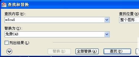 直接在CAD中輸入命令find,彈出查找和替換對話框。如下圖所示: