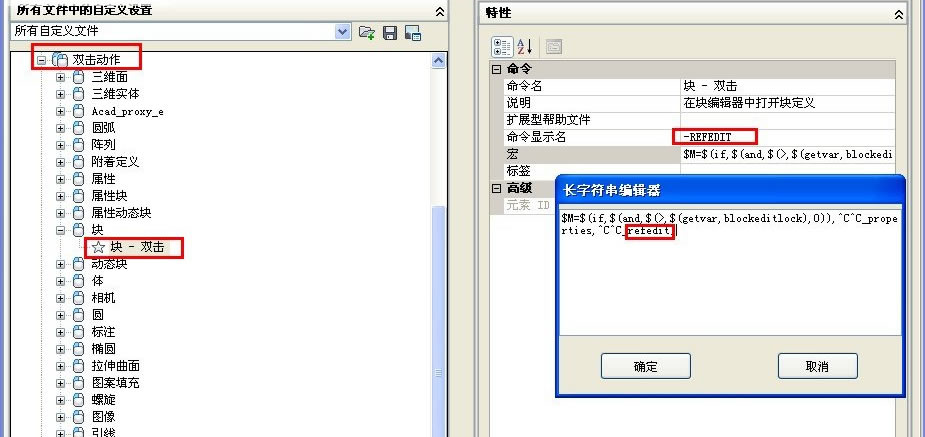 在命令行輸入cui,打開自定義界面管理器,在“所有文件中的自定義設置”窗口中展開“雙擊動作”----“塊”,點中“塊-雙擊”,然后在"特性"窗口中“命令”表格中的“宏”那一行末尾"bedit"改為"refedit",當然“命令顯示名”那一行改為"-REFEDIT",應用,確定即可。