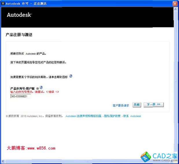 2)、在點擊激活前,請先做斷開你的網絡以避免被在線檢查序列號。如果不想斷開網絡而想能激活,那么在你第一次點擊激活時,系統會提示你系列號錯誤,此時你只需要點“關閉”并再次點擊激活就可以了。