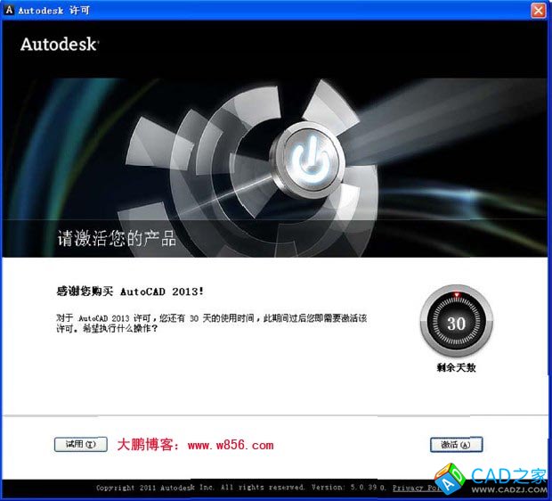 1)、 啟動AutoCAD 2013,此時將會提示產品需要激活,如果不激活,那就只能試用30 天。