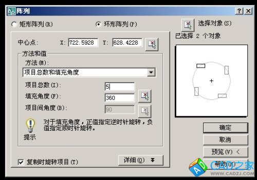 9、點(diǎn)“陣列”命令,按圖九設(shè)置對話框,點(diǎn)對話框中的“選擇對象”后把兩個(gè)面域(三角形)都選上,點(diǎn)“中心店”右面的按鈕然后在捕捉下面的三條線的交點(diǎn)。點(diǎn)確認(rèn)