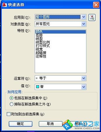 qselect命令,然后就打開了“快速選擇”菜單,然后一看就明白了,給你上圖看下。顏色,線型等等都可以根據(jù)不同的條件選擇的。