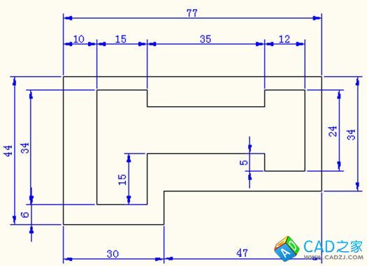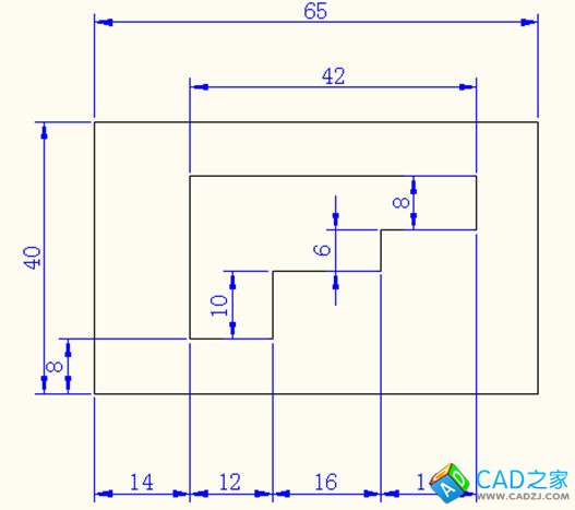 繪圖步驟:先建立兩個圖層分別是繪圖、尺寸標注圖層;外框從兩個方向(上、右)利用正交模式畫,內(nèi)框從點(10,6)開始,利用正交模式和相關線段尺寸畫出;最后按照原圖進行尺寸標注。