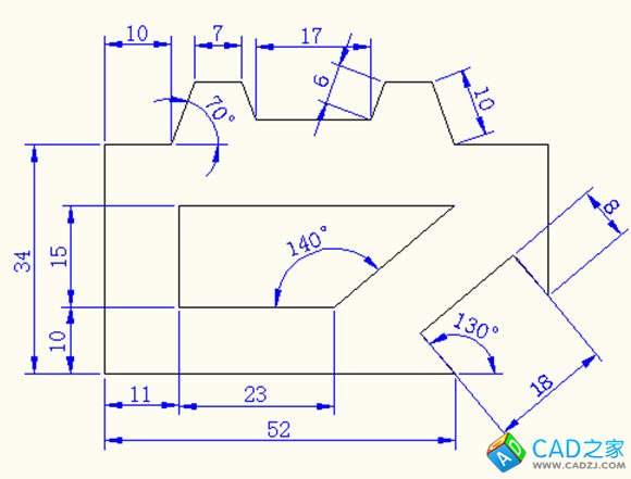 繪圖步驟:先建立兩個圖層分別是繪圖、尺寸標注圖層;外框從點(0,0)開始,分別沿上、右兩個方向畫各線段,至于斜線段可使用極坐標追蹤模式在已知角度和長度的情況下畫出;內(nèi)框從點(11,10)開始,上端線先畫一條水平長點的直線,畫相應斜線與其相交,再修剪即可;最后進行尺寸標注。