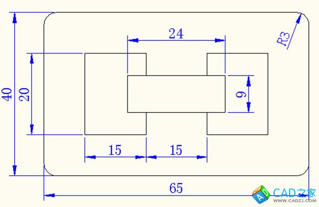 繪圖步驟:建立兩個圖層分別是繪圖、尺寸標注圖層,使用RECTANG命令和相關坐標繪制圓角矩形框,分別用兩點坐標法畫三個矩形框,剪切多余的線段;進行尺寸標注。