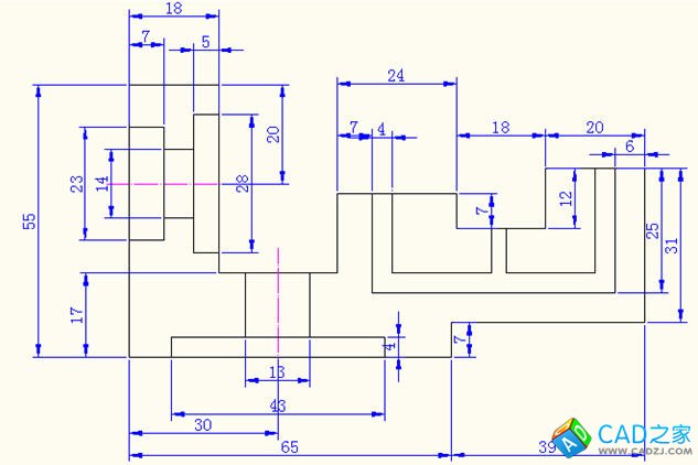 繪圖步驟:建立三個圖層,分別為繪圖、尺寸標注、輔助線圖層;繪制輔助線,利用計算的坐標和原圖給的相應線段尺寸完成外框;里面的圖形可通過計算相對偏移量來進行相應的偏移即可依次完成各線段的畫法,修剪多余線段;最后進行尺寸標注。